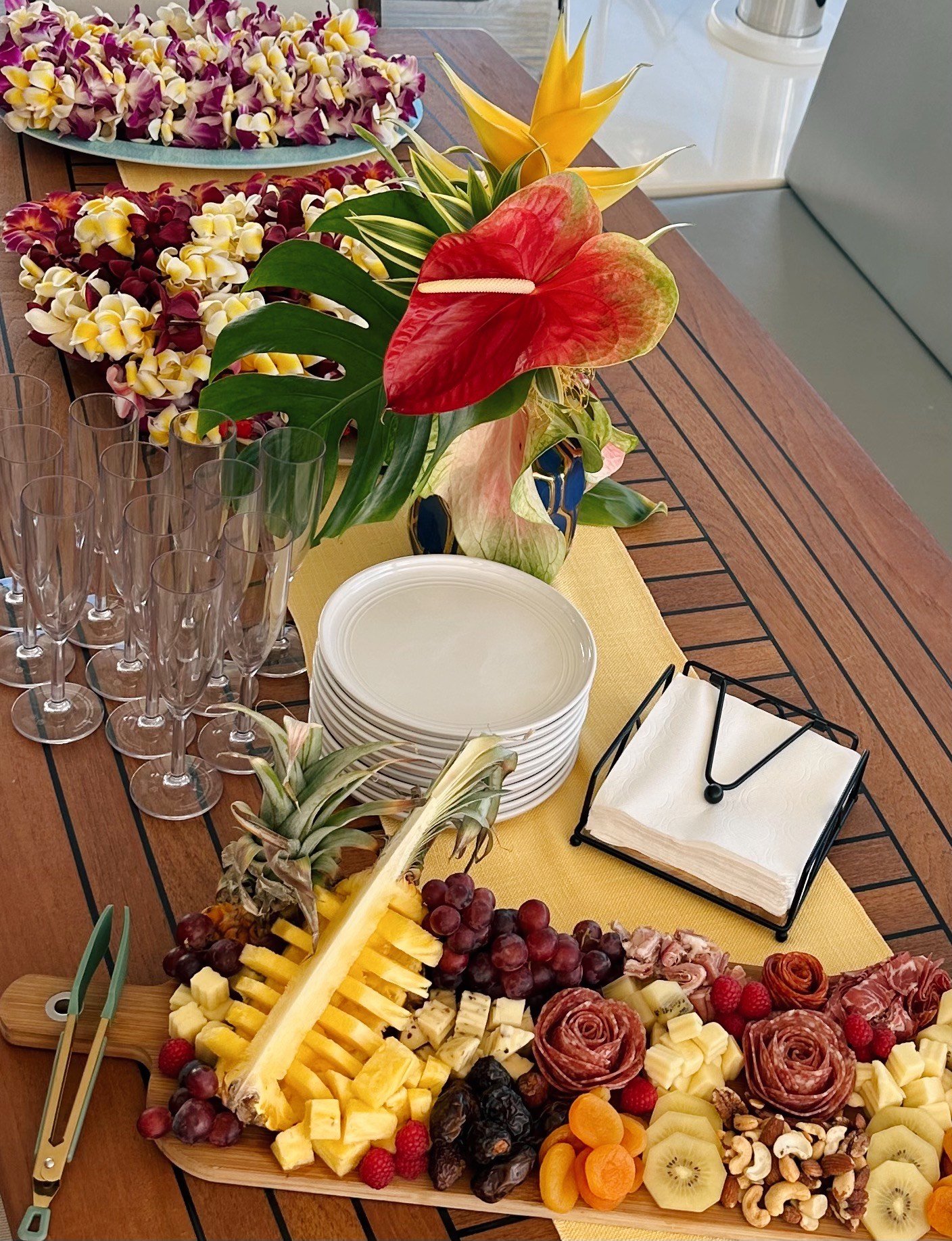 When you arrive for your day of sailing in Waikiki, you will be welcomed with a glass of champagne and refreshing cold towels infused with eucalyptus. A beautifully arranged charcuterie board will be waiting for you to enjoy as you take in the vibrant surroundings. It is the perfect way to kick off a relaxing day on the water.
